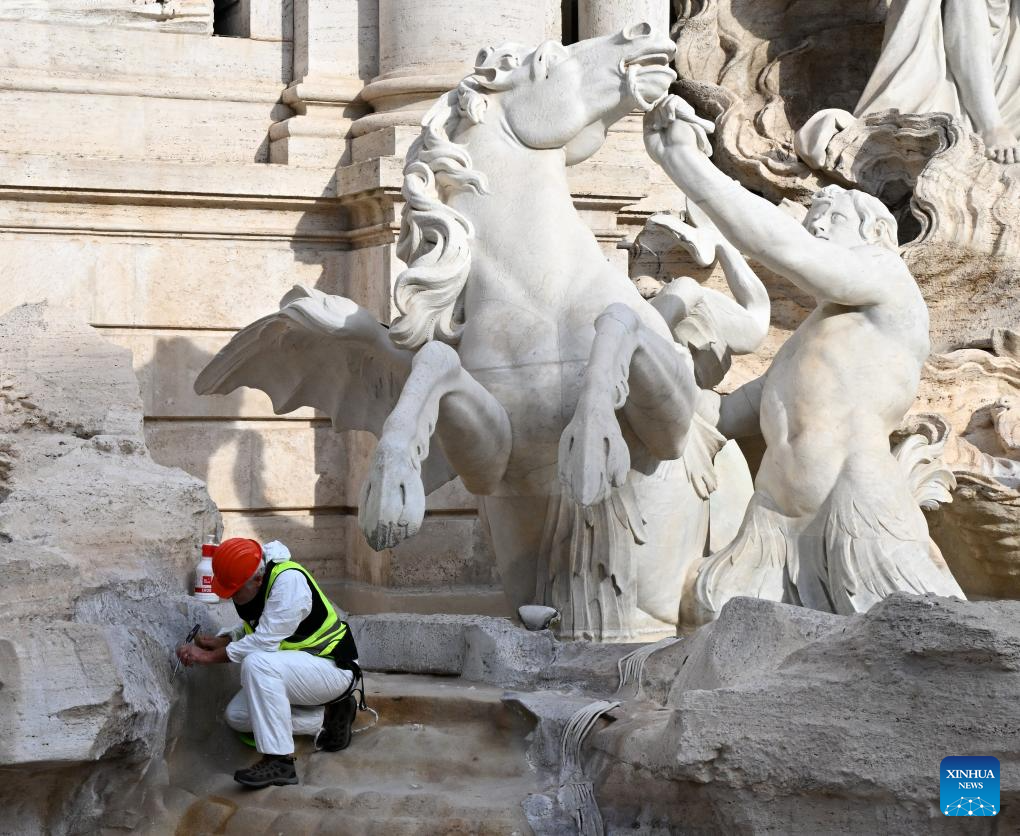 A staff member carries out maintenance work at the Trevi Fountain in Rome, Italy, Nov. 9, 2024. Rome inaugurated an elevated walkway across the front of the Trevi Fountain on Saturday as the Baroque monument undergoes maintenance work. The redesign will provide visitors a closer view of the site, while also ensuring a steady movement of visitors. (Photo by Alberto Lingria/Xinhua)
