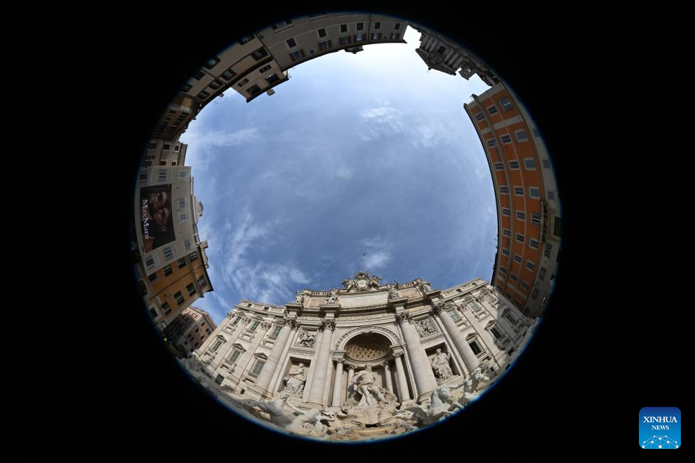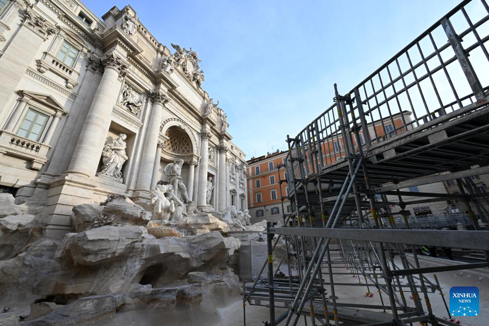 This photo taken on Nov. 9, 2024 shows the Trevi Fountain in Rome, Italy. Rome inaugurated an elevated walkway across the front of the Trevi Fountain on Saturday as the Baroque monument undergoes maintenance work. The redesign will provide visitors a closer view of the site, while also ensuring a steady movement of visitors. (Photo by Alberto Lingria/Xinhua)