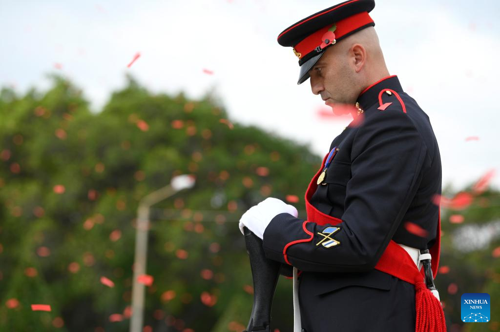 A soldier is seen during the Remembrance Day ceremony at the War Memorial in Floriana, Malta, on Nov. 10, 2024. Malta marked Remembrance Day to remember victims who sacrificed their lives during the two world wars on Sunday. (Photo by Jonathan Borg/Xinhua)