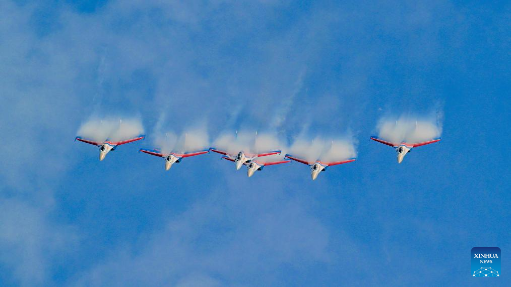 Aircraft of the Bayi Aerobatic Team of the Chinese People's Liberation Army Air Force conduct adaptive training in Zhuhai, south China's Guangdong Province, Nov. 8, 2024. The 15th China International Aviation and Aerospace Exhibition, also known as Airshow China, was held in Zhuhai from Nov. 12 to 17. (Photo by Xu Yang/Xinhua)