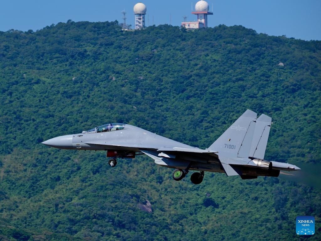 China's J-15 carrier-based fighter jets conduct adaptive training in Zhuhai, south China's Guangdong Province, Nov. 9, 2024. The 15th China International Aviation and Aerospace Exhibition, also known as Airshow China, was held in Zhuhai from Nov. 12 to 17. (Photo by Xu Yang/Xinhua)