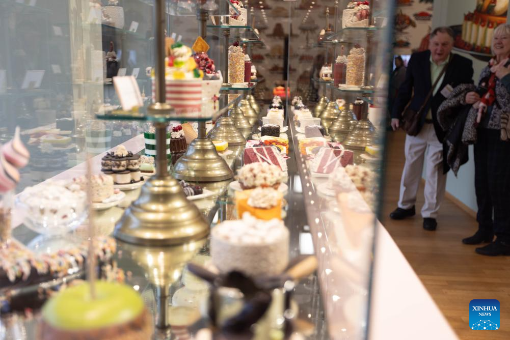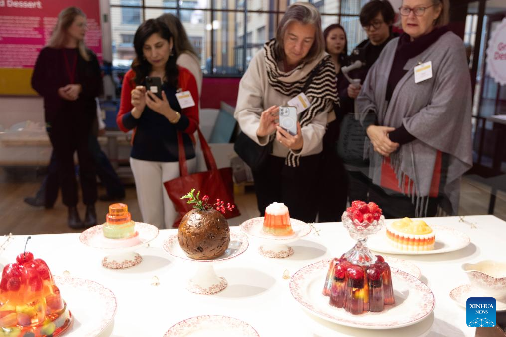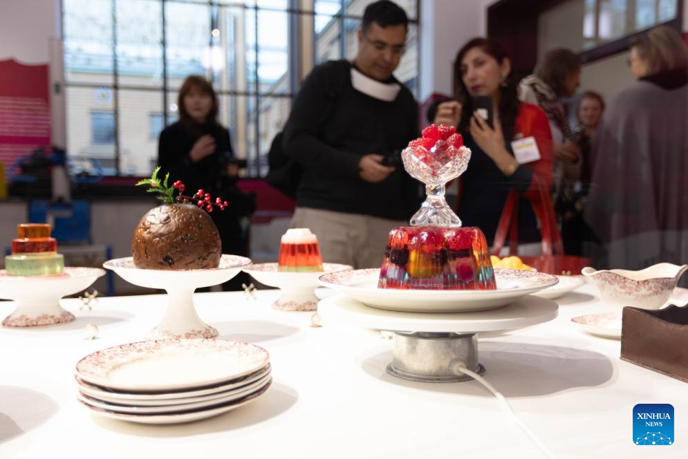 People view exhibits during a press preview of the exhibition Grand Dessert - The History of Dessert at the Kunstmuseum in The Hague, the Netherlands, on Nov. 22, 2024. Showcasing a rich array of desserts through centuries of culinary culture, the exhibition will be open to the general public from Nov. 23, 2024 to April 6, 2025. (Photo by Sylvia Lederer/Xinhua)