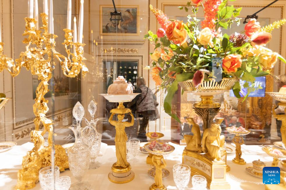 A dessert table is seen during a press preview of the exhibition Grand Dessert - The History of Dessert at the Kunstmuseum in The Hague, the Netherlands, on Nov. 22, 2024. Showcasing a rich array of desserts through centuries of culinary culture, the exhibition will be open to the general public from Nov. 23, 2024 to April 6, 2025. (Photo by Sylvia Lederer/Xinhua)