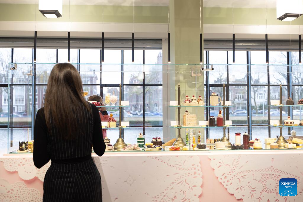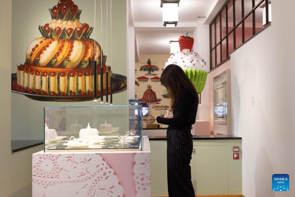 People are seen during a press preview of the exhibition Grand Dessert - The History of Dessert at the Kunstmuseum in The Hague, the Netherlands, on Nov. 22, 2024. Showcasing a rich array of desserts through centuries of culinary culture, the exhibition will be open to the general public from Nov. 23, 2024 to April 6, 2025. (Photo by Sylvia Lederer/Xinhua)