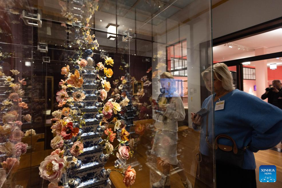 A woman views sugar flowers during a press preview of the exhibition Grand Dessert - The History of Dessert at the Kunstmuseum in The Hague, the Netherlands, on Nov. 22, 2024. Showcasing a rich array of desserts through centuries of culinary culture, the exhibition will be open to the general public from Nov. 23, 2024 to April 6, 2025. (Photo by Sylvia Lederer/Xinhua)
