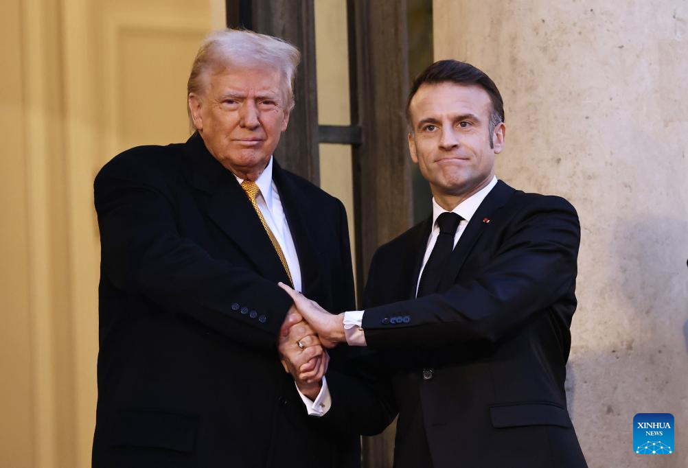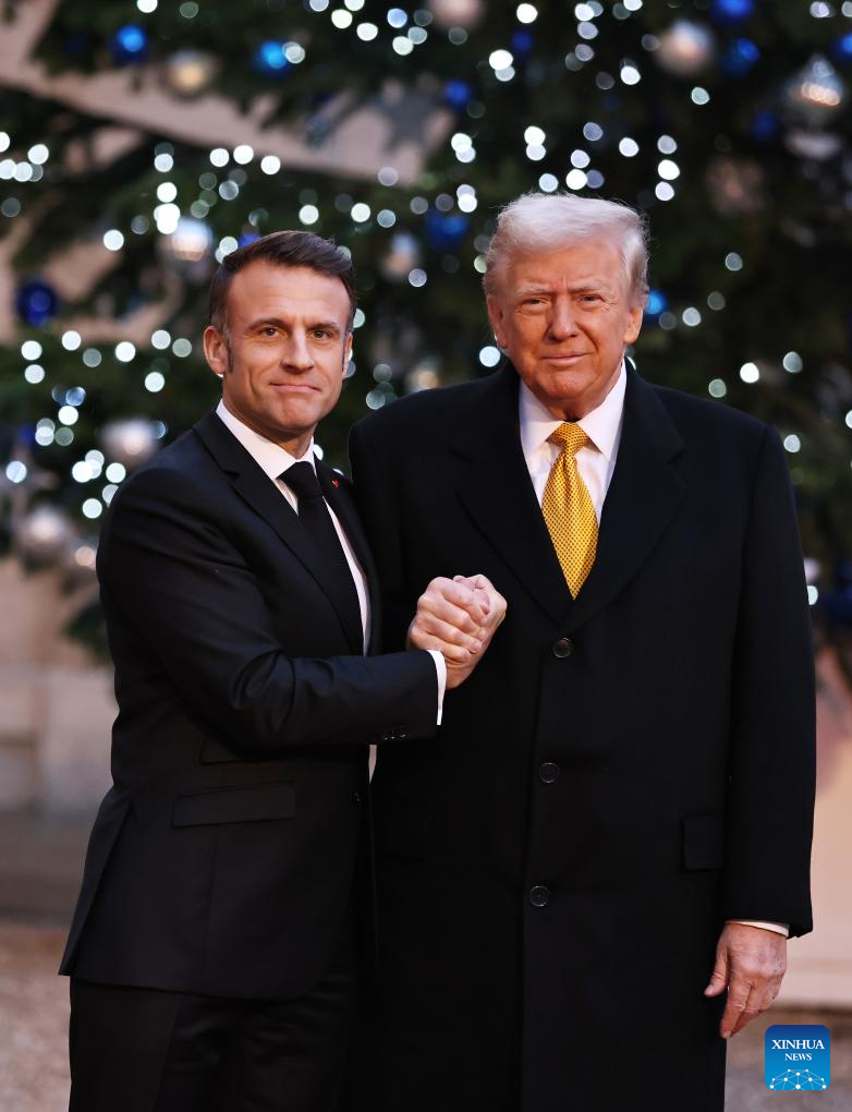 French President Emmanuel Macron (L) meets with U.S. President-elect Donald Trump at the Elysee Palace in Paris, France, Dec. 7, 2024. Macron met with Trump here prior to the inauguration ceremony for the restored Notre-Dame de Paris cathedral. (Xinhua/Gao Jing)
