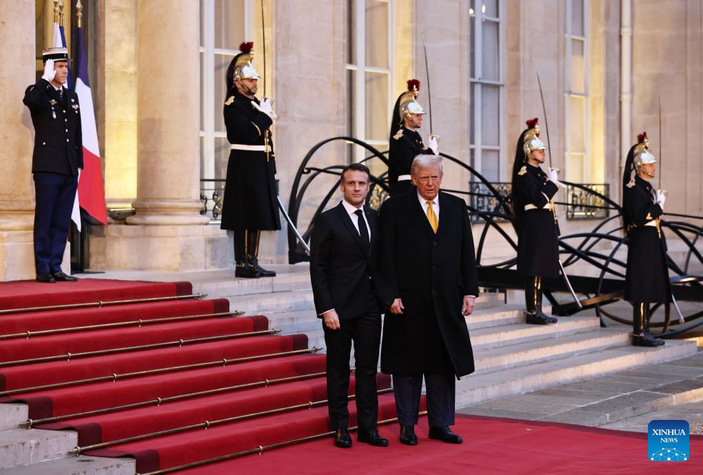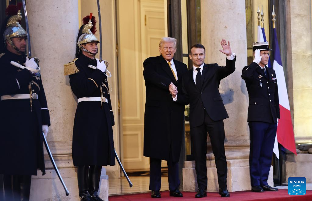 French President Emmanuel Macron (L, front) meets with U.S. President-elect Donald Trump (R, front) at the Elysee Palace in Paris, France, Dec. 7, 2024. Macron met with Trump here prior to the inauguration ceremony for the restored Notre-Dame de Paris cathedral. (Xinhua/Gao Jing)