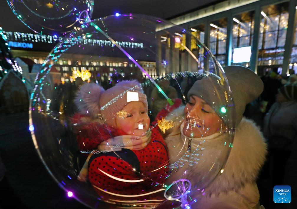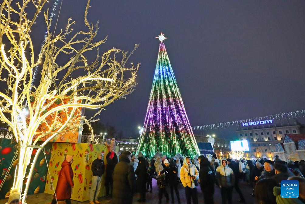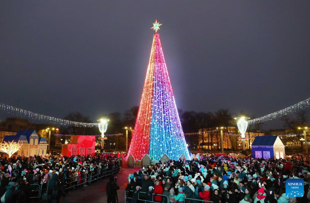 People take part in the New Year tree lighting ceremony in October Square in Minsk, Belarus, on Dec. 10, 2024. (Photo by Henadz Zhinkov/Xinhua)