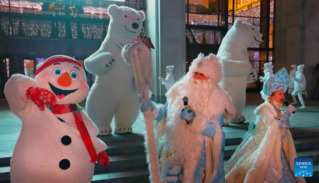 Actors perform during the New Year tree lighting ceremony in October Square in Minsk, Belarus, on Dec. 10, 2024. (Photo by Henadz Zhinkov/Xinhua)