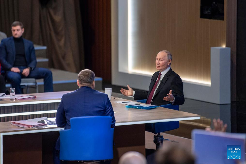 Russian President Vladimir Putin (L) speaks during his annual press conference in Moscow, Russia, Dec. 19, 2024. (Xinhua/Cao Yang)