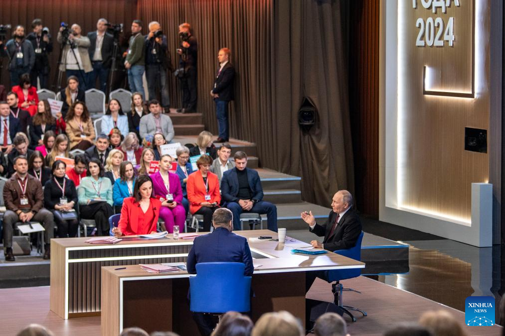 Russian President Vladimir Putin (R) speaks during his annual press conference in Moscow, Russia, Dec. 19, 2024. (Xinhua/Bai Xueqi)