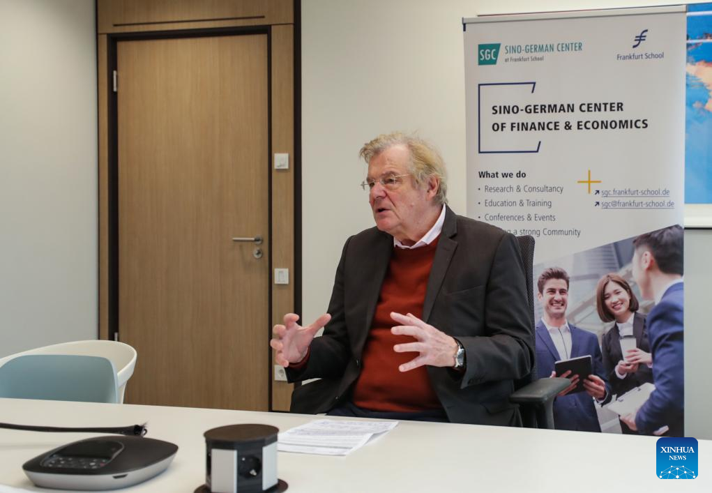 Horst Loechel, professor of economics and co-chairman of the Sino-German Center at the Frankfurt School of Finance and Management, speaks during an interview with Xinhua News Agency in Frankfurt, Germany, Dec. 16, 2024. China's recent stimulus measures came at the right time to boost investor confidence worldwide, the leading German economist said. As two large exporters, both Germany and China have benefited from economic globalization and trade liberalization, and made due contributions, he noted, stressing that joint efforts are still needed to "promote free, open trade and work against protectionism."(Xinhua/Zhang Fan)