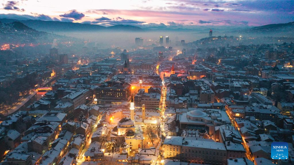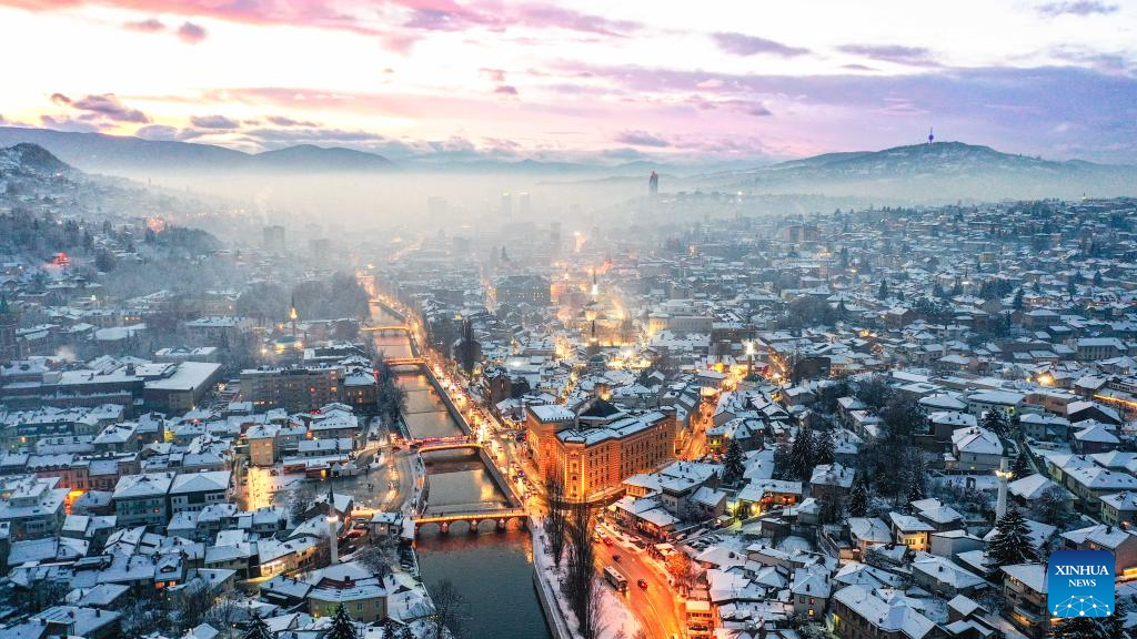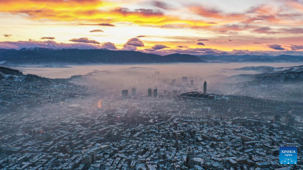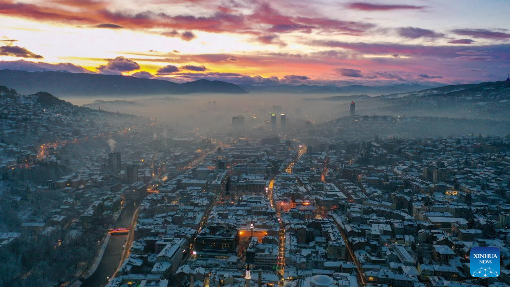 An aerial drone photo taken on Jan. 5, 2025 shows a winter view at sunset in Sarajevo, Bosnia and Herzegovina. Sarajevo is the capital and largest city of Bosnia and Herzegovina. Located in the east-central part of Bosnia and Herzegovina, it is situated in a hilly area, surrounded by mountains, with a population of about 300,000. (Xinhua/Yin Xiaosheng)