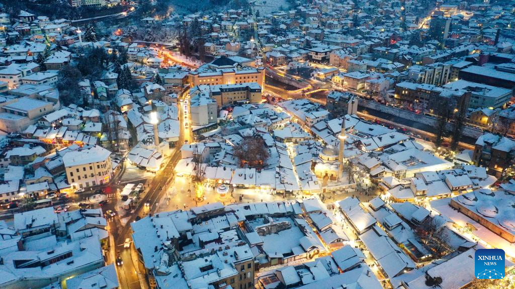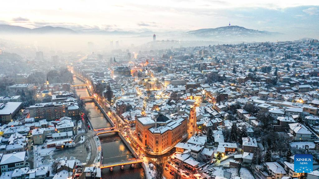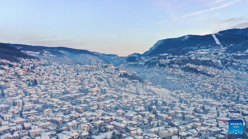 An aerial drone photo taken on Jan. 5, 2025 shows a winter view in Sarajevo, Bosnia and Herzegovina. Sarajevo is the capital and largest city of Bosnia and Herzegovina. Located in the east-central part of Bosnia and Herzegovina, it is situated in a hilly area, surrounded by mountains, with a population of about 300,000. (Xinhua/Yin Xiaosheng)