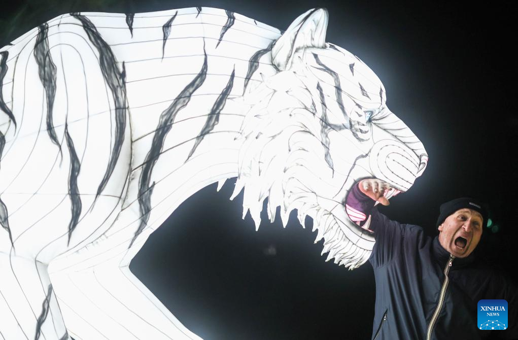 A man visits a Chinese lantern exhibition at a park in Rome, Italy, Jan. 6, 2025. (Xinhua/Li Jing)