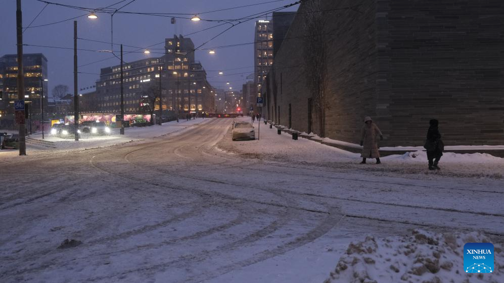 People are seen on a street in the snow in Oslo, capital of Norway, Jan. 6, 2025. Europe is grappling with a powerful wave of extreme winter weather, including heavy snow, sleet, and storms, which has disrupted transportation and infrastructure across the continent, leaving travelers stranded and local communities struggling to manage the chaos. (Xinhua/Zhang Yuliang)