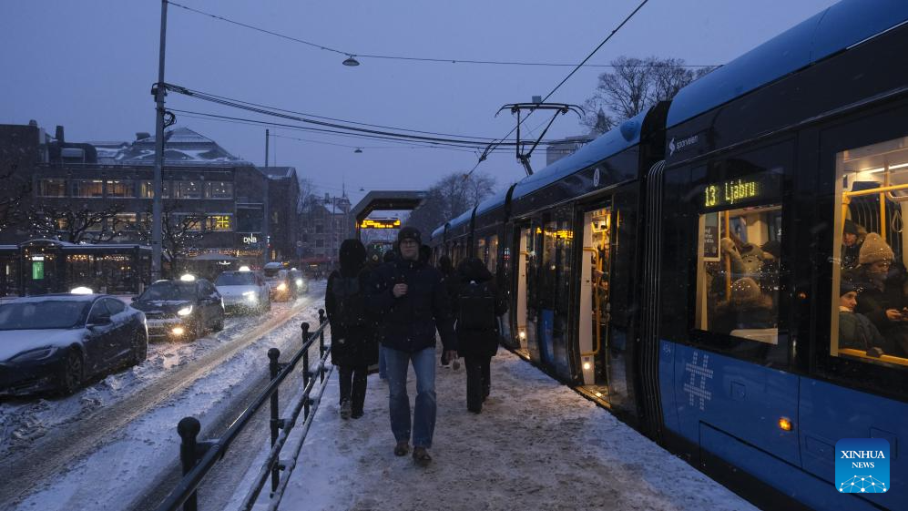 Passengers get on and off a tram in snow in Oslo, capital of Norway, Jan. 6, 2025. Europe is grappling with a powerful wave of extreme winter weather, including heavy snow, sleet, and storms, which has disrupted transportation and infrastructure across the continent, leaving travelers stranded and local communities struggling to manage the chaos. (Xinhua/Zhang Yuliang)