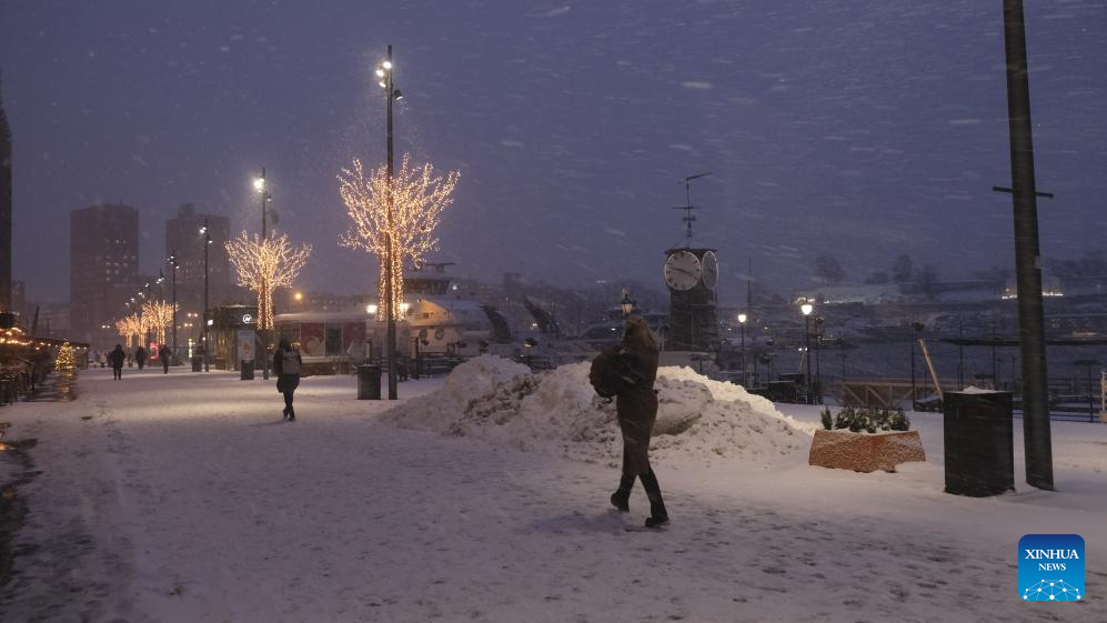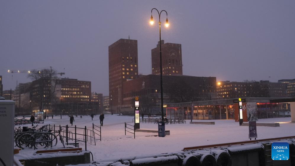 Pedestrians walk on a street in snow in Oslo, capital of Norway, Jan. 6, 2025. Europe is grappling with a powerful wave of extreme winter weather, including heavy snow, sleet, and storms, which has disrupted transportation and infrastructure across the continent, leaving travelers stranded and local communities struggling to manage the chaos. (Xinhua/Zhang Yuliang)