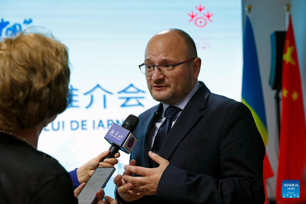 Cristian Ciuciureanu, general manager of Itinera Venus Travel, speaks during an interview with Xinhua at an event promoting winter tourism in China at the Chinese Cultural Centre in Bucharest, Romania, on Jan. 13, 2025. (Photo by Cristian Cristel/Xinhua)