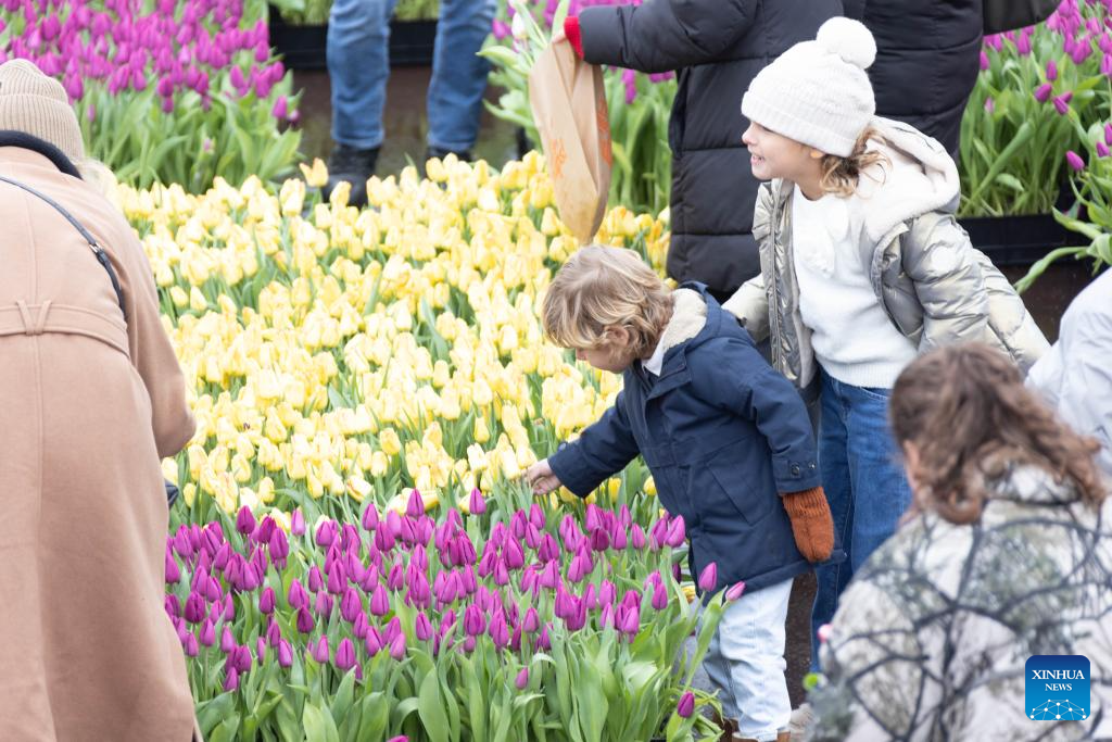 People pick tulips at a picking garden on the Museum Square in Amsterdam, the Netherlands, Jan. 18, 2025. People celebrated the National Tulip Day on Saturday, which is traditionally marked on the third Saturday of the year. (Photo by Sylvia Lederer/Xinhua)