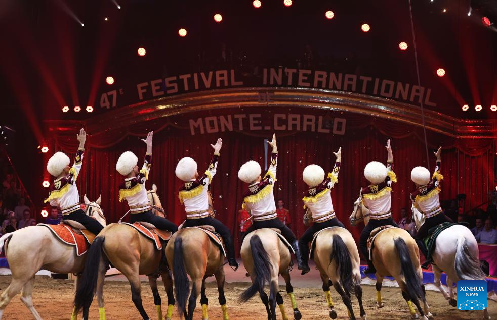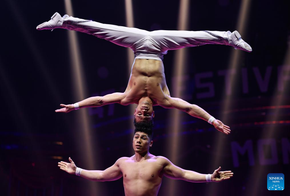 Acrobats from Turkmenistan perform at the 47th International Circus Festival of Monte-Carlo, Monaco, Jan. 18, 2025. The 47th International Circus Festival of Monte-Carlo kicked off here on Friday and will last till Jan. 26. (Xinhua/Gao Jing)