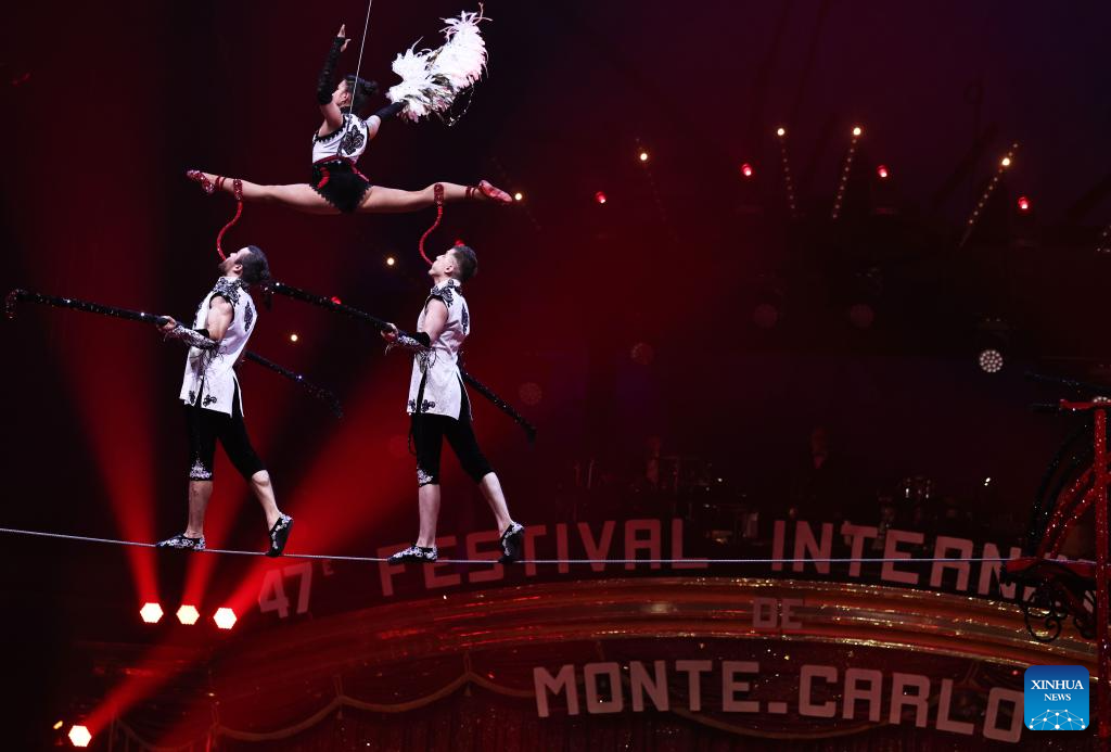 Acrobats from the United States and Canada perform at the 47th International Circus Festival of Monte-Carlo, Monaco, Jan. 18, 2025. The 47th International Circus Festival of Monte-Carlo kicked off here on Friday and will last till Jan. 26. (Xinhua/Gao Jing)