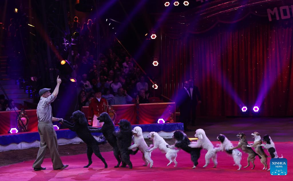 An acrobat performs dog training at the 47th International Circus Festival of Monte-Carlo, Monaco, Jan. 18, 2025. The 47th International Circus Festival of Monte-Carlo kicked off here on Friday and will last till Jan. 26. (Xinhua/Gao Jing)