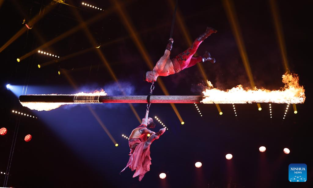 Acrobats from Uzbekistan perform at the 47th International Circus Festival of Monte-Carlo, Monaco, Jan. 18, 2025. The 47th International Circus Festival of Monte-Carlo kicked off here on Friday and will last till Jan. 26. (Xinhua/Gao Jing)