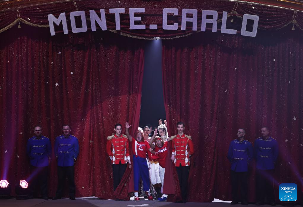 Acrobats salute the audiences at the 47th International Circus Festival of Monte-Carlo, Monaco, Jan. 18, 2025. The 47th International Circus Festival of Monte-Carlo kicked off here on Friday and will last till Jan. 26. (Xinhua/Gao Jing)
