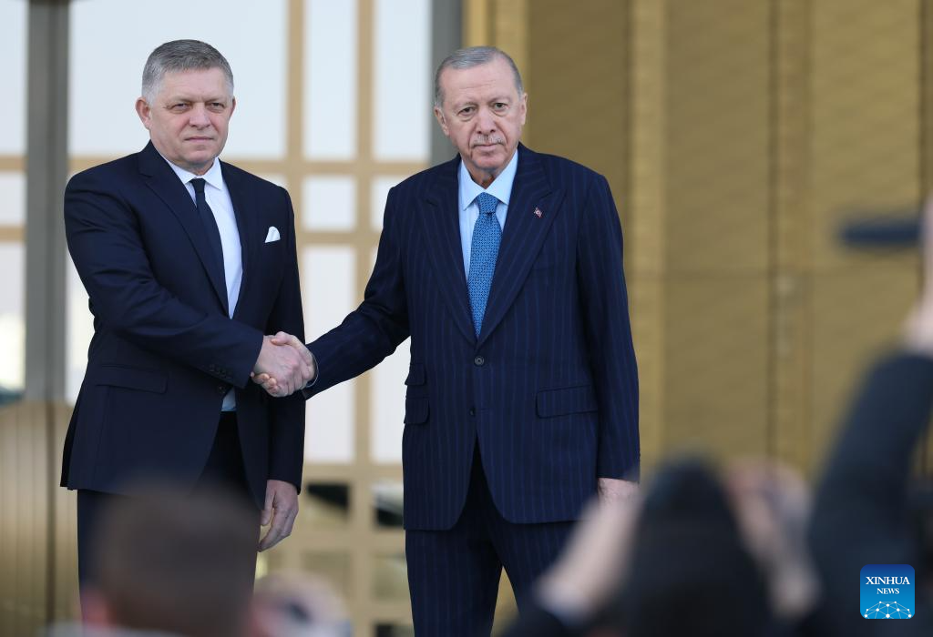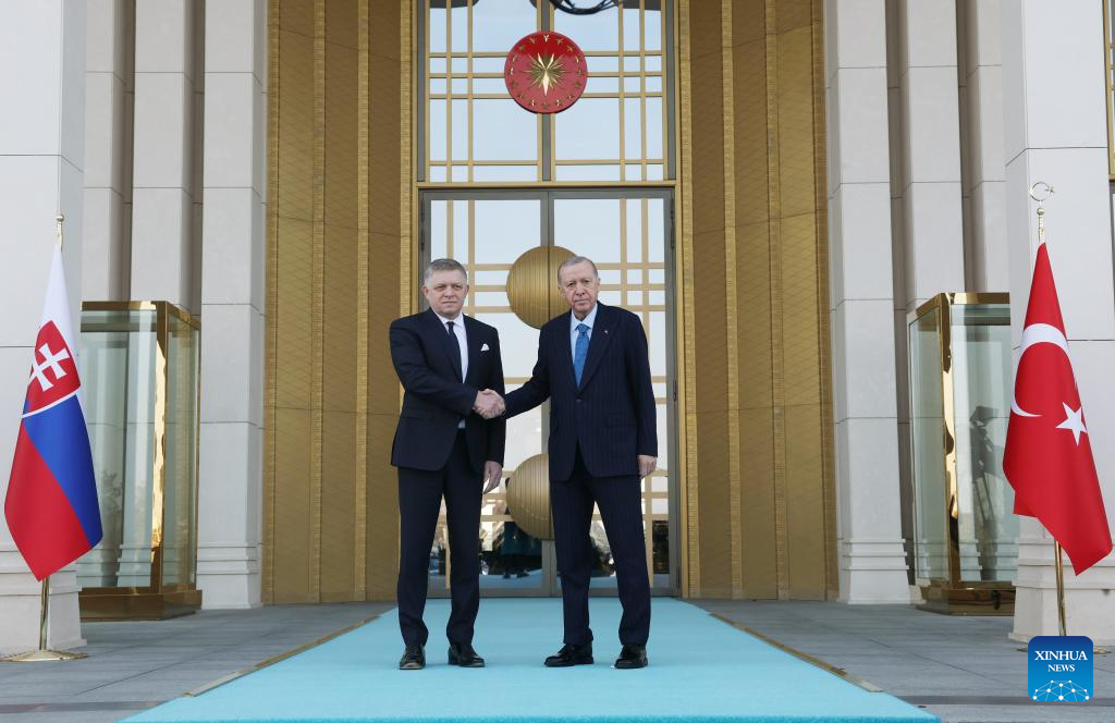 Turkish President Recep Tayyip Erdogan (R) shakes hands with Slovak Prime Minister Robert Fico at the Presidential Complex in Ankara, Türkiye, on Jan. 20, 2025. Türkiye and Slovakia on Monday signed a joint declaration to elevate the bilateral relations to the level of strategic partnership, Turkish President Recep Tayyip Erdogan said. (Mustafa Kaya/Handout via Xinhua)