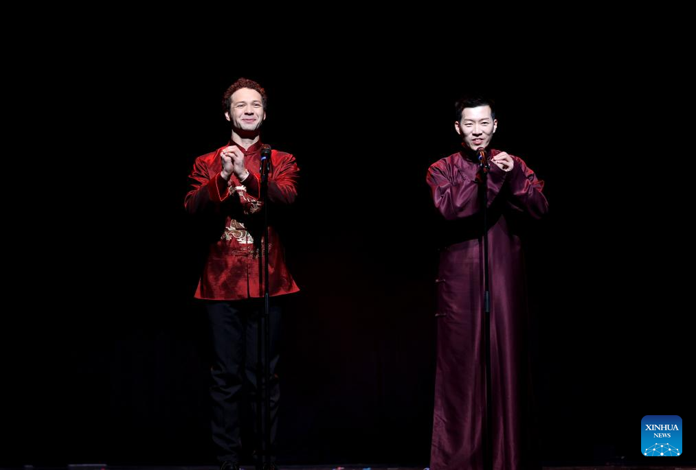 Artists gesture during a cross-talk performance named "Cheer for China" at Chinese Students and Scholars Association UK (CSSAUK) Chinese New Year Gala in London, Britain, Jan. 21, 2025. The Chinese New Year falls on Jan. 29 this year, kicking off the upcoming Year of the Snake. (Xinhua/Li Ying)
