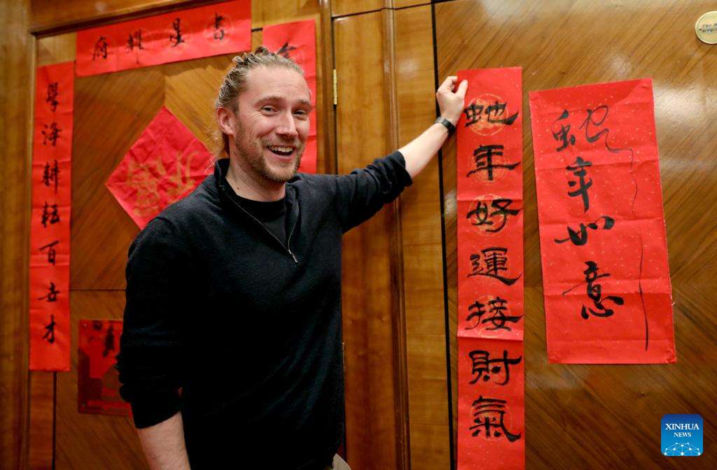 A man holds a Spring Festival couplet during "Happy Chinese New Year - Charm of Jiangsu" Cultural and Tourism Promotion, held in London, Britain, Jan. 21, 2025. (Xinhua/Li Ying)