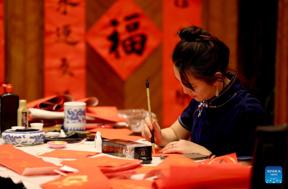 An artist shows Chinese calligraphy during "Happy Chinese New Year - Charm of Jiangsu" Cultural and Tourism Promotion, held in London, Britain, Jan. 21, 2025. (Xinhua/Li Ying)