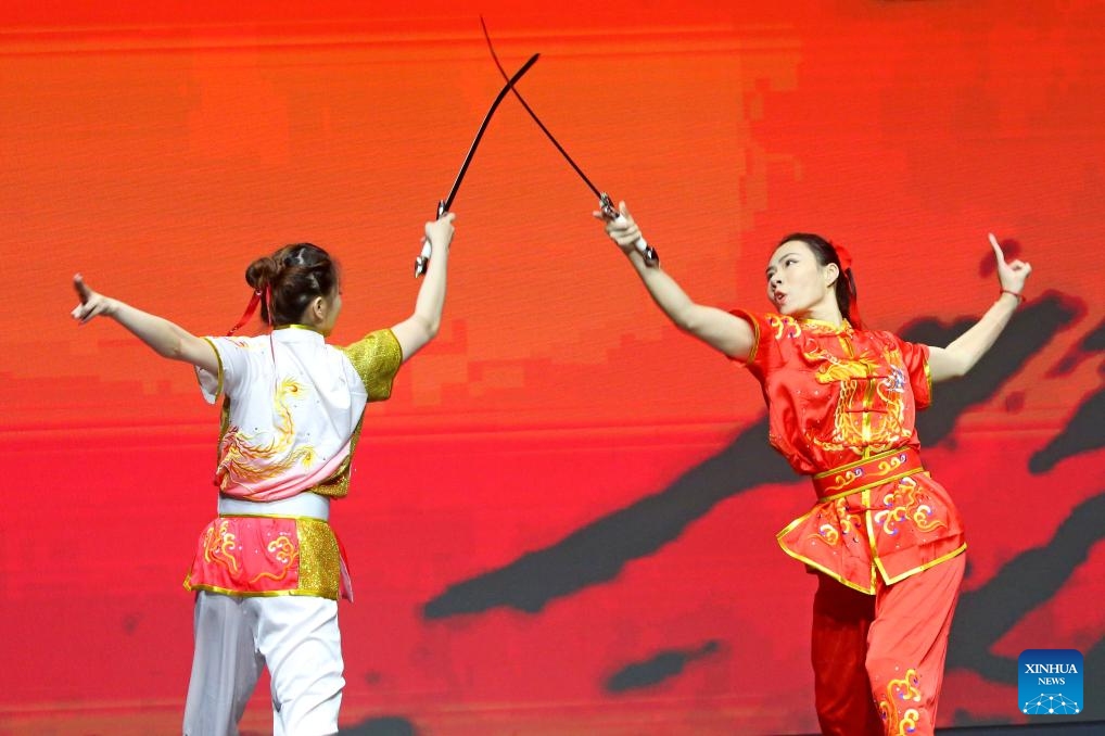 Chinese students perform martial arts during a gala held to greet the upcoming Spring Festival, or Chinese New Year, in Minsk, Belarus, Jan. 20, 2025. (Photo by Henadz Zhinkov/Xinhua)