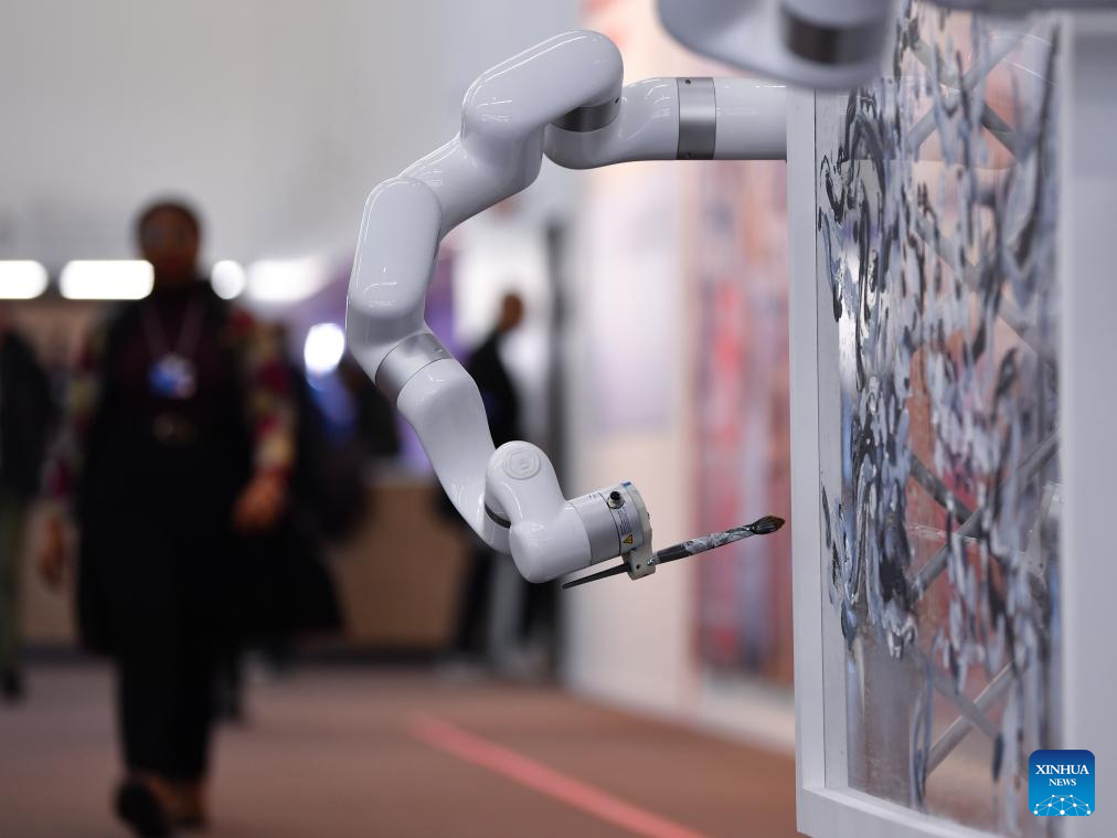 A painting robotic arm is pictured at the Congress Center for the World Economic Forum (WEF) Annual Meeting in Davos, Switzerland, Jan. 23, 2025.