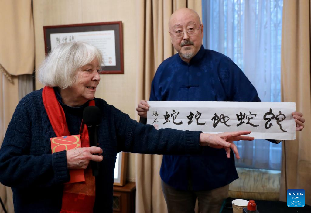 British sinologist Frances Wood (L) attends the "Intangible Cultural Heritage Yaji" event in London, Britain, Jan. 23, 2025. (Xinhua/Li Ying)