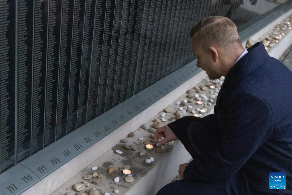 A man lays a candle in commemoration of Holocaust victims at the Holocaust Memorial Center in Budapest, Hungary on Jan. 27, 2025. Hungarian Minister of Regional Development Tibor Navracsics described the Holocaust as the "indefensible, inexplicable low point of European civilization" during a commemoration in Budapest on Monday. The event at the Holocaust Memorial Center marked International Holocaust Remembrance Day and the 80th anniversary of Auschwitz's liberation. (Xinhua/Attila Volgyi)