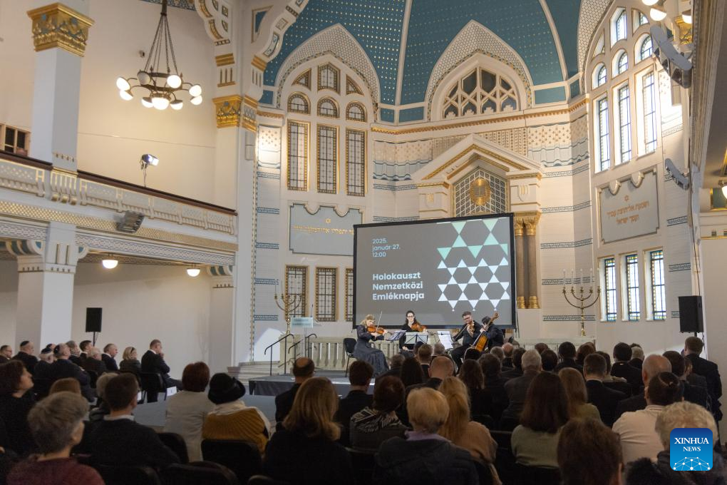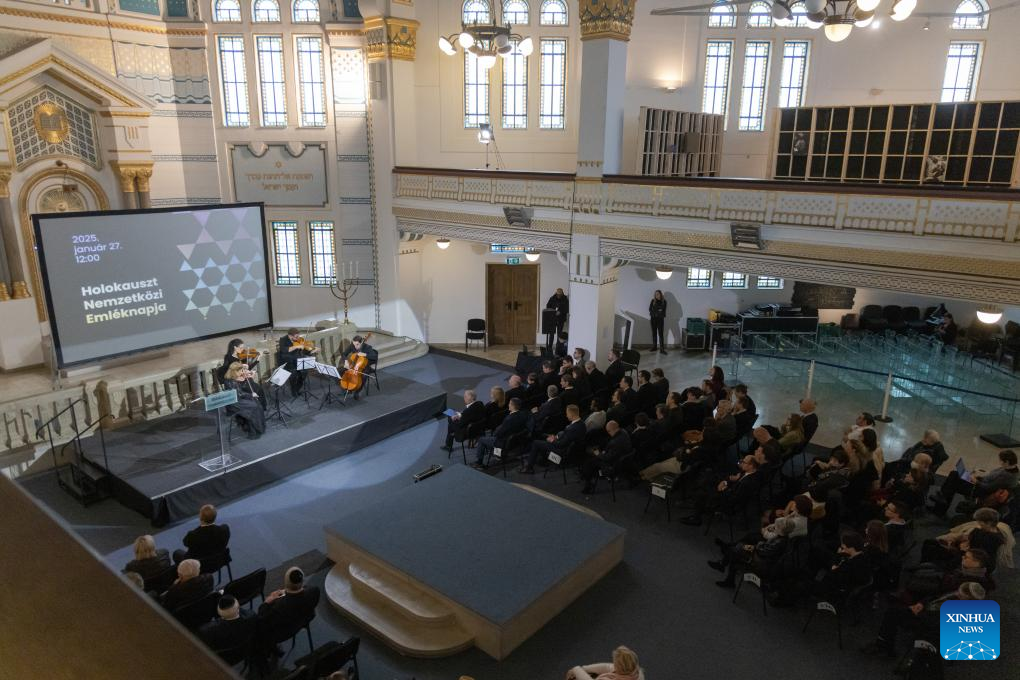 The event at the Holocaust Memorial Center marked International Holocaust Remembrance Day and the 80th anniversary of Auschwitz's liberation. (Xinhua/Attila Volgyi)