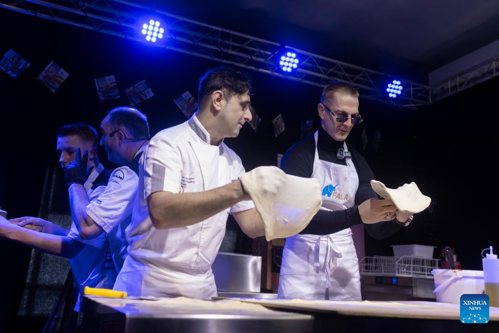 Participants make pizza during the 18th International Specialised Fairs of Tastes in Ljubljana, Slovenia, Jan. 29, 2025. (Photo by Zeljko Stevanic/Xinhua)
