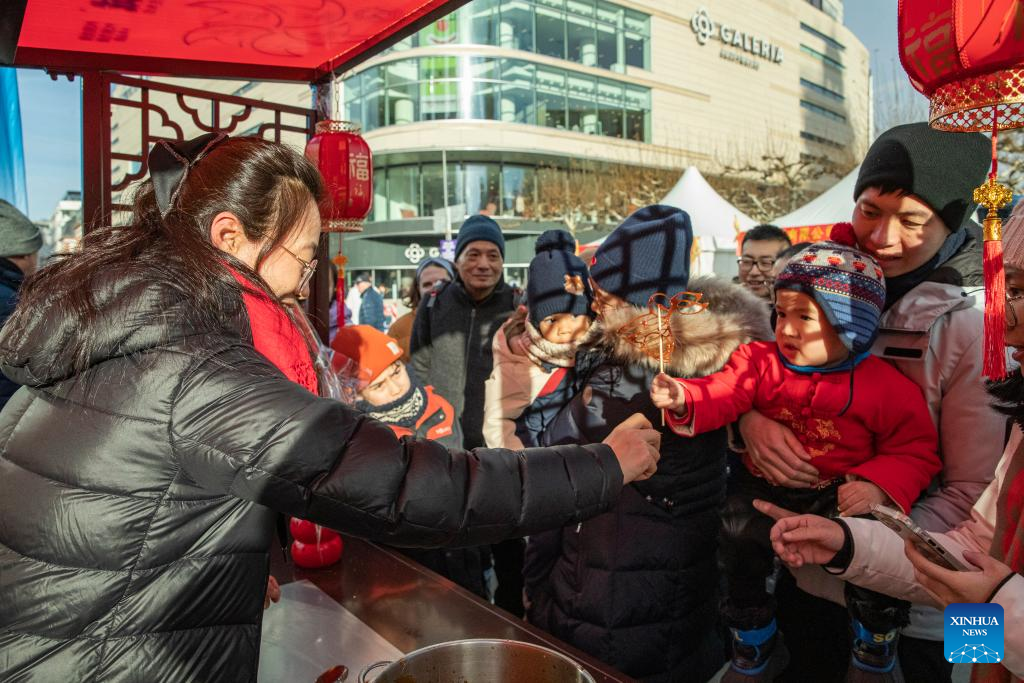 A vendor passes sugar painting to a child during the Spring Festival temple fair in Frankfurt, Germany, on Jan. 31, 2025. The first Spring Festival temple fair in Frankfurt kicked off on Friday. The fair celebrates Chinese New Year with a wide range of festive events, and will run until Feb. 2. (Xinhua/Zhang Fan)