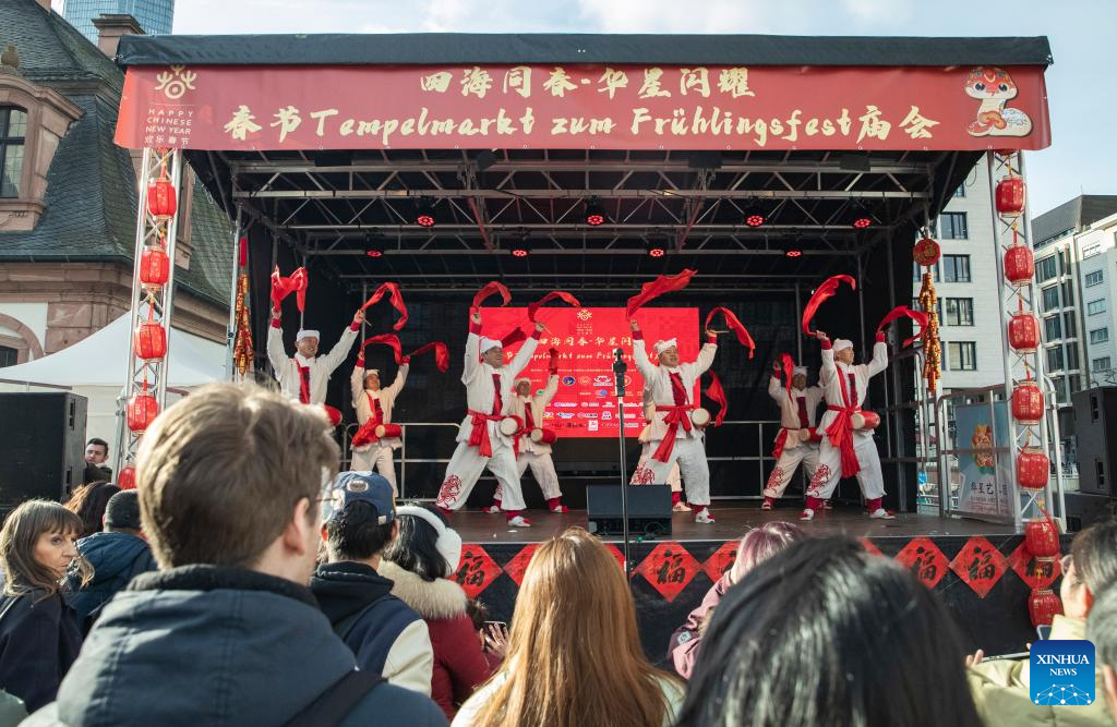 Actors perform Ansai waist drum during the Spring Festival temple fair in Frankfurt, Germany, on Jan. 31, 2025. The first Spring Festival temple fair in Frankfurt kicked off on Friday. The fair celebrates Chinese New Year with a wide range of festive events, and will run until Feb. 2. (Xinhua/Zhang Fan)