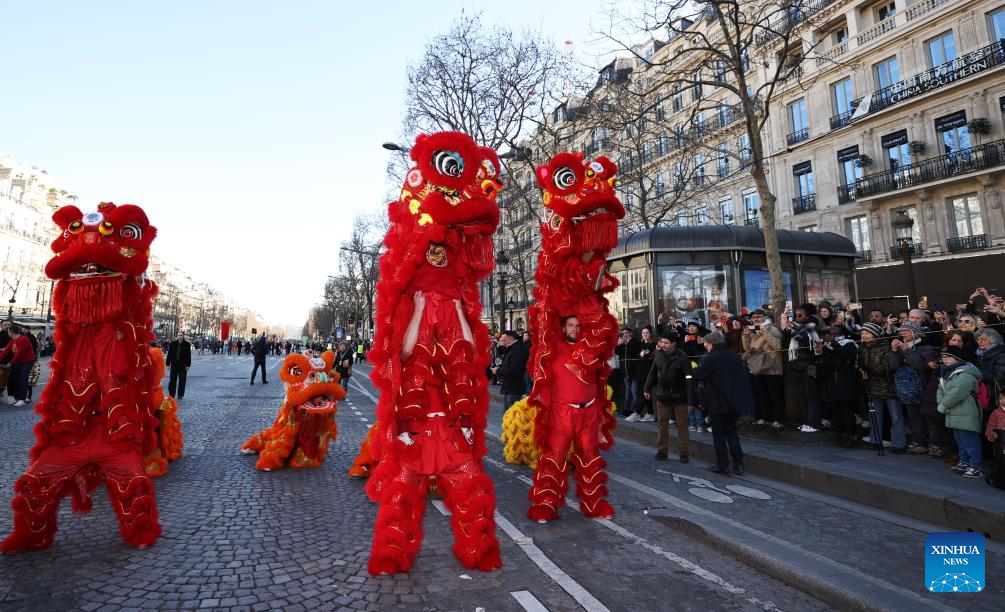 People watch a lion dance performance to celebrate the Spring Festival, or the Chinese New Year on the Champs-Elysees avenue in Paris, France, Feb. 2, 2025. (Xinhua/Gao Jing)