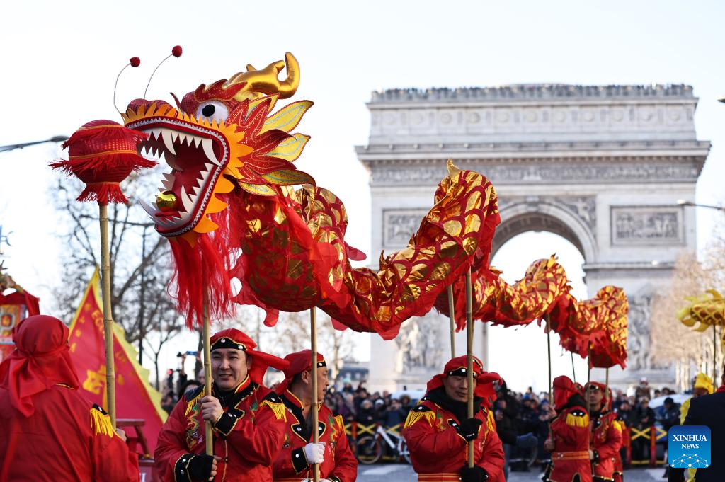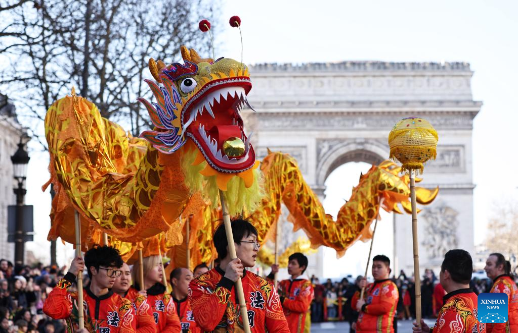 People watch a dragon dance performance to celebrate the Spring Festival, or the Chinese New Year on the Champs-Elysees avenue in Paris, France, Feb. 2, 2025. (Xinhua/Gao Jing)