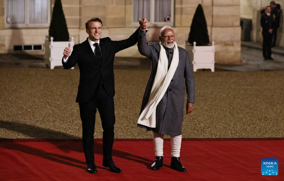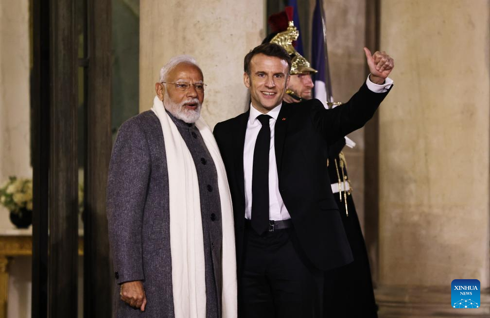 French President Emmanuel Macron (R) welcomes Indian Prime Minister Narendra Modi ahead of a dinner on the sidelines of the Artificial Intelligence (AI) Action Summit at the presidential Elysee palace in Paris, France, on Feb. 10, 2025. The Artificial Intelligence (AI) Action Summit opened on Monday in Paris, focusing on the discussion of global AI governance. (Xinhua/Gao Jing)