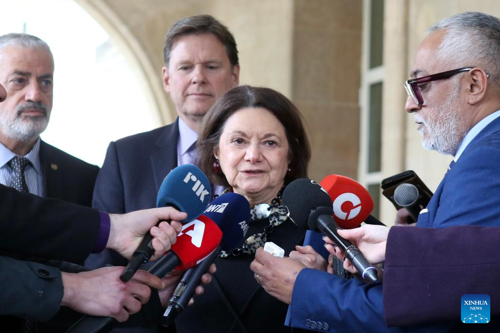 UN Under-Secretary-General for Peacebuilding Rosemary DiCarlo (C) speaks to the media in Nicosia, Cyprus, on Feb. 10, 2025. The United Nations (UN) envoy met separately with Greek and Turkish Cypriot leaders on Monday, inviting them to an expanded meeting aimed at reviving stalled Cyprus peace negotiations in March. (Photo by George Christophorou/Xinhua)