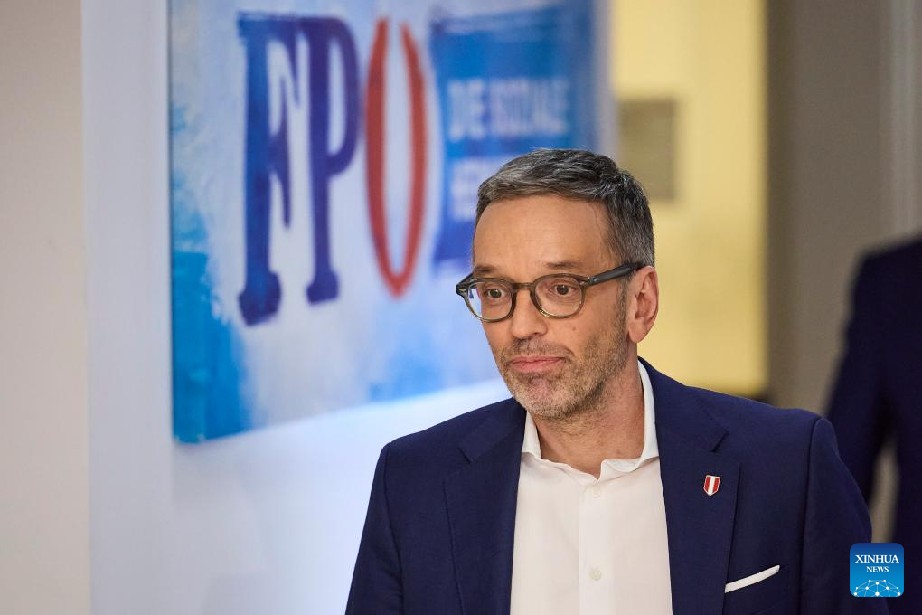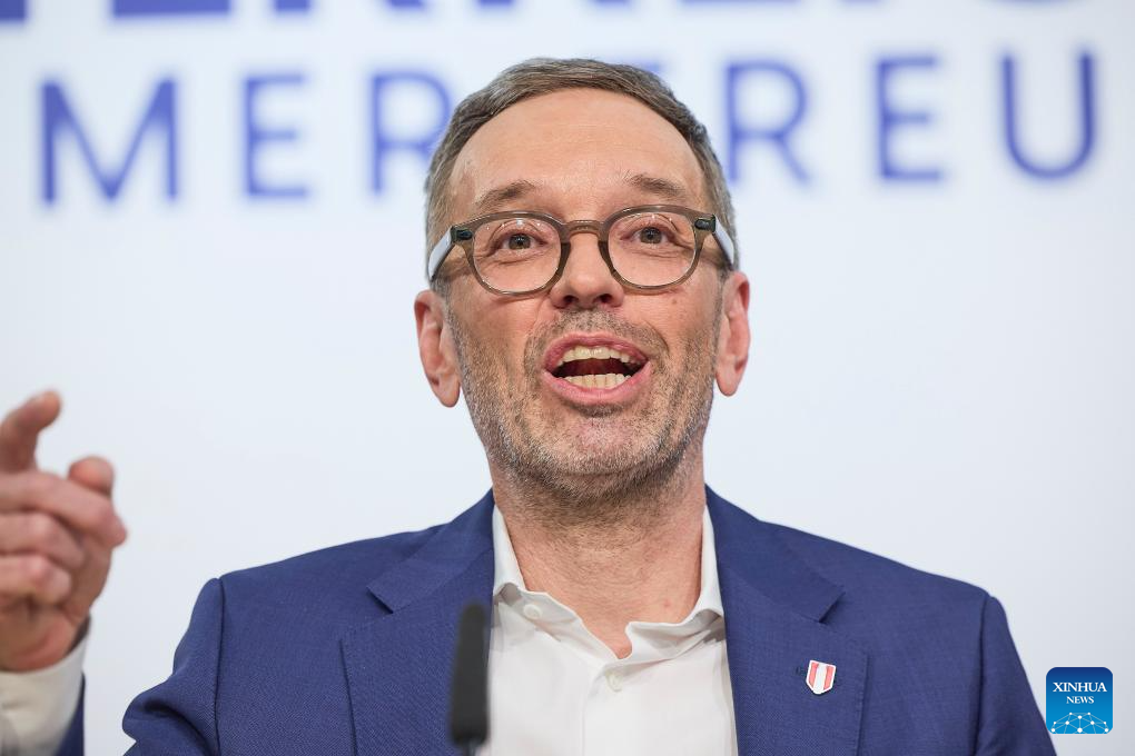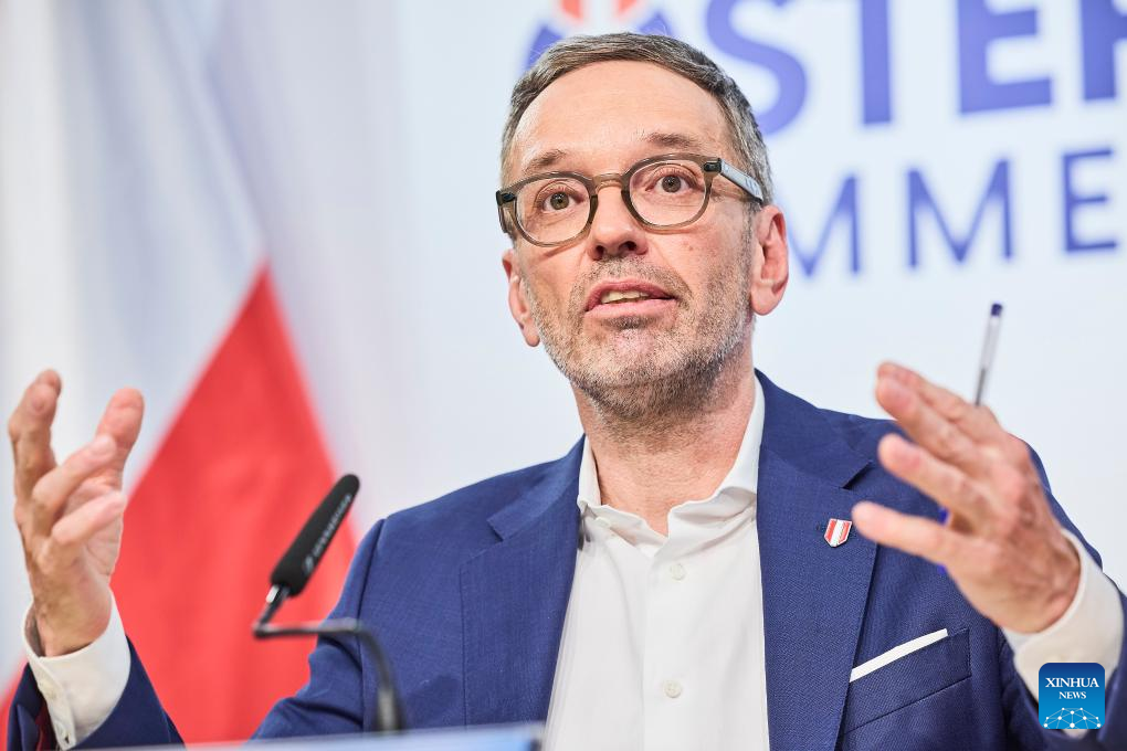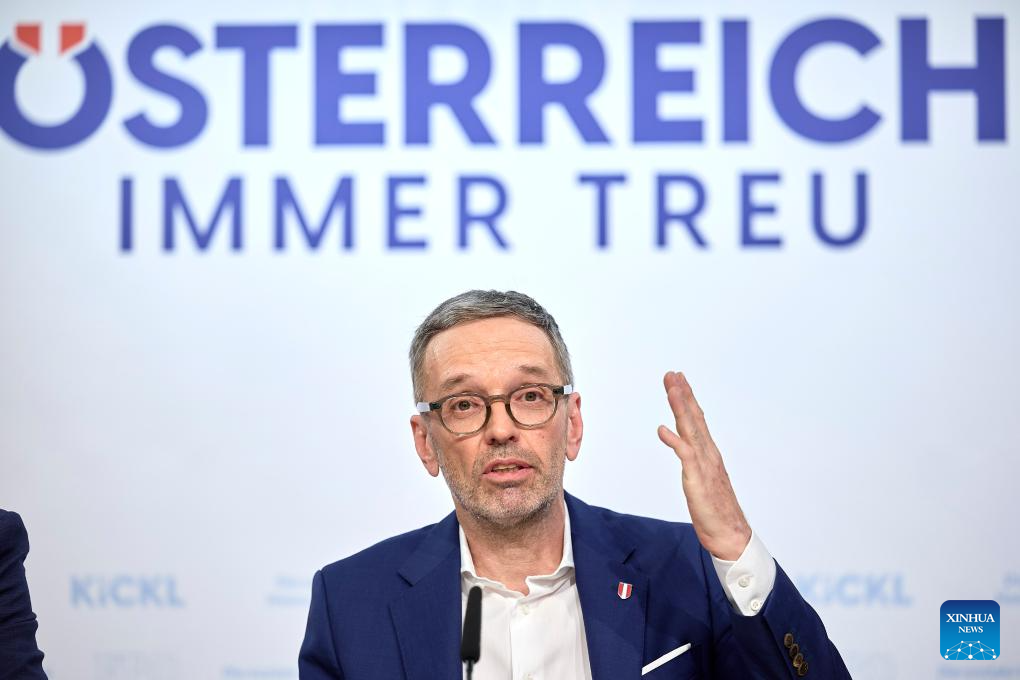 Freedom Party leader Herbert Kickl speaks at a press conference in Vienna, Austria, Feb. 12, 2025. Efforts to form a coalition government in Austria collapsed on Wednesday after negotiations between the far-right Freedom Party and the conservative People's Party broke down.