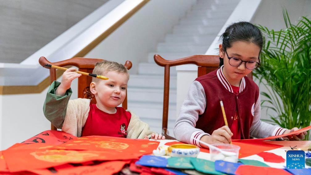 Two kids write Chinese character "Fu," which means good fortune, during an exhibition on the Chinese zodiac at the China Cultural Center in Belgrade, Serbia on Feb. 12, 2025. The China Cultural Center in Belgrade marked the end of Chinese Spring Festival festivities in Serbia on Wednesday with an exhibition on the Chinese zodiac and yuanxiao.