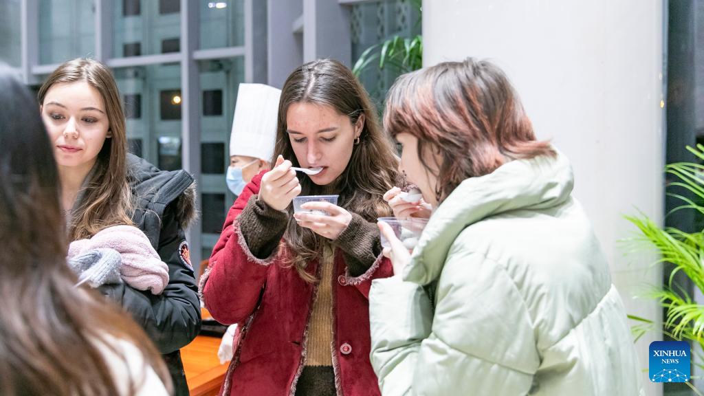 People taste yuanxiao during an exhibition on the Chinese zodiac at the China Cultural Center in Belgrade, Serbia on Feb. 12, 2025. The China Cultural Center in Belgrade marked the end of Chinese Spring Festival festivities in Serbia on Wednesday with an exhibition on the Chinese zodiac and yuanxiao.