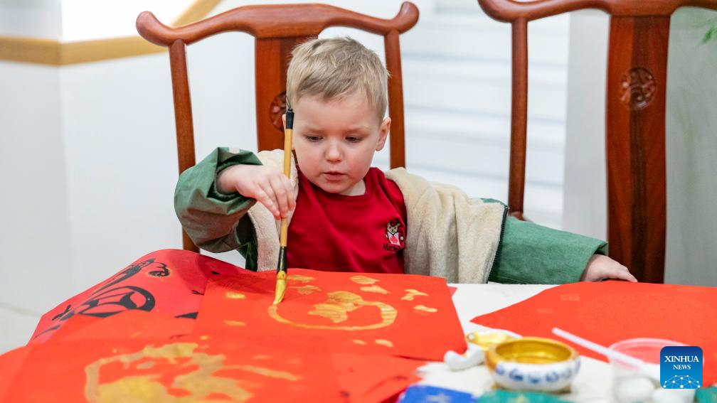 A kid writes Chinese character "Fu," which means good fortune, during an exhibition on the Chinese zodiac at the China Cultural Center in Belgrade, Serbia on Feb. 12, 2025. The China Cultural Center in Belgrade marked the end of Chinese Spring Festival festivities in Serbia on Wednesday with an exhibition on the Chinese zodiac and yuanxiao.