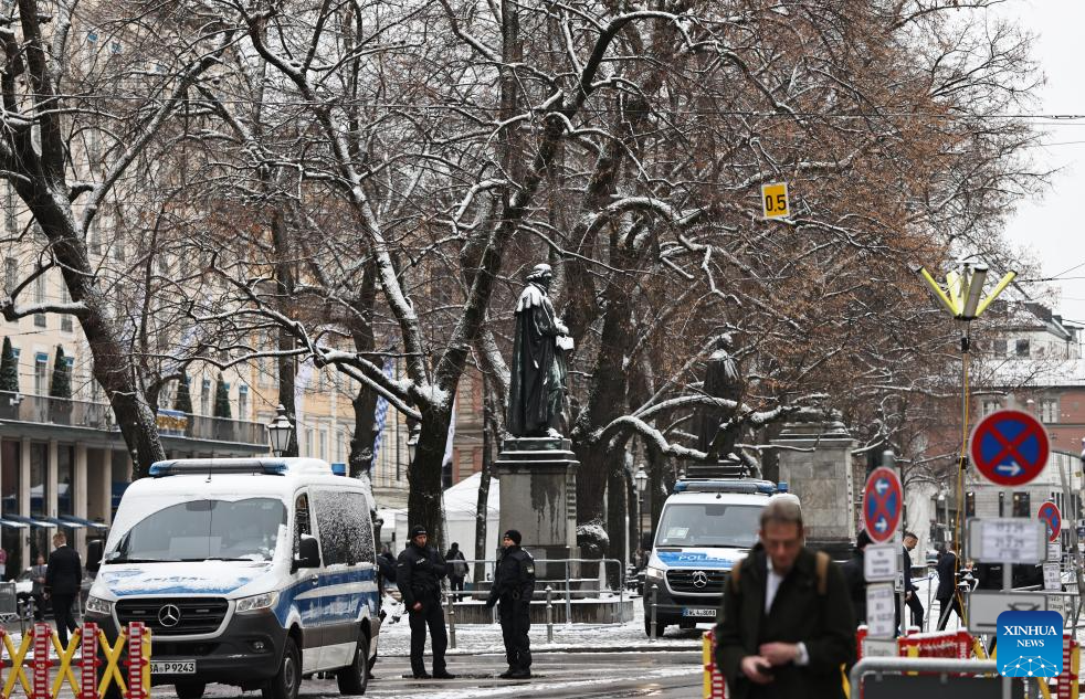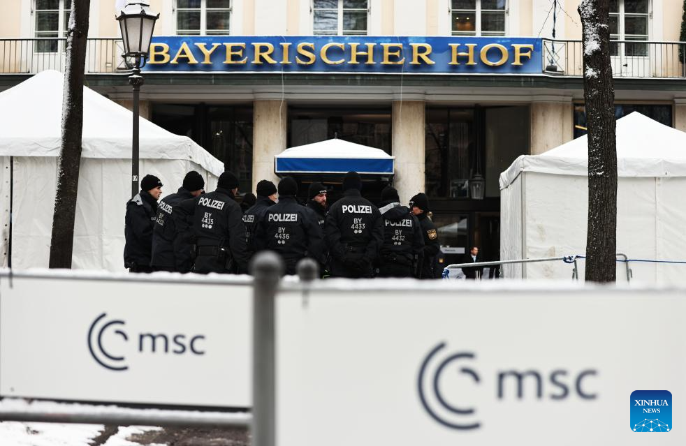 Policemen guard outside the main conference site of the 61st Munich Security Conference (MSC) in Munich, Germany, Feb. 14, 2025. The 61st Munich Security Conference is held here from Friday to Sunday. (Xinhua/Gao Jing)